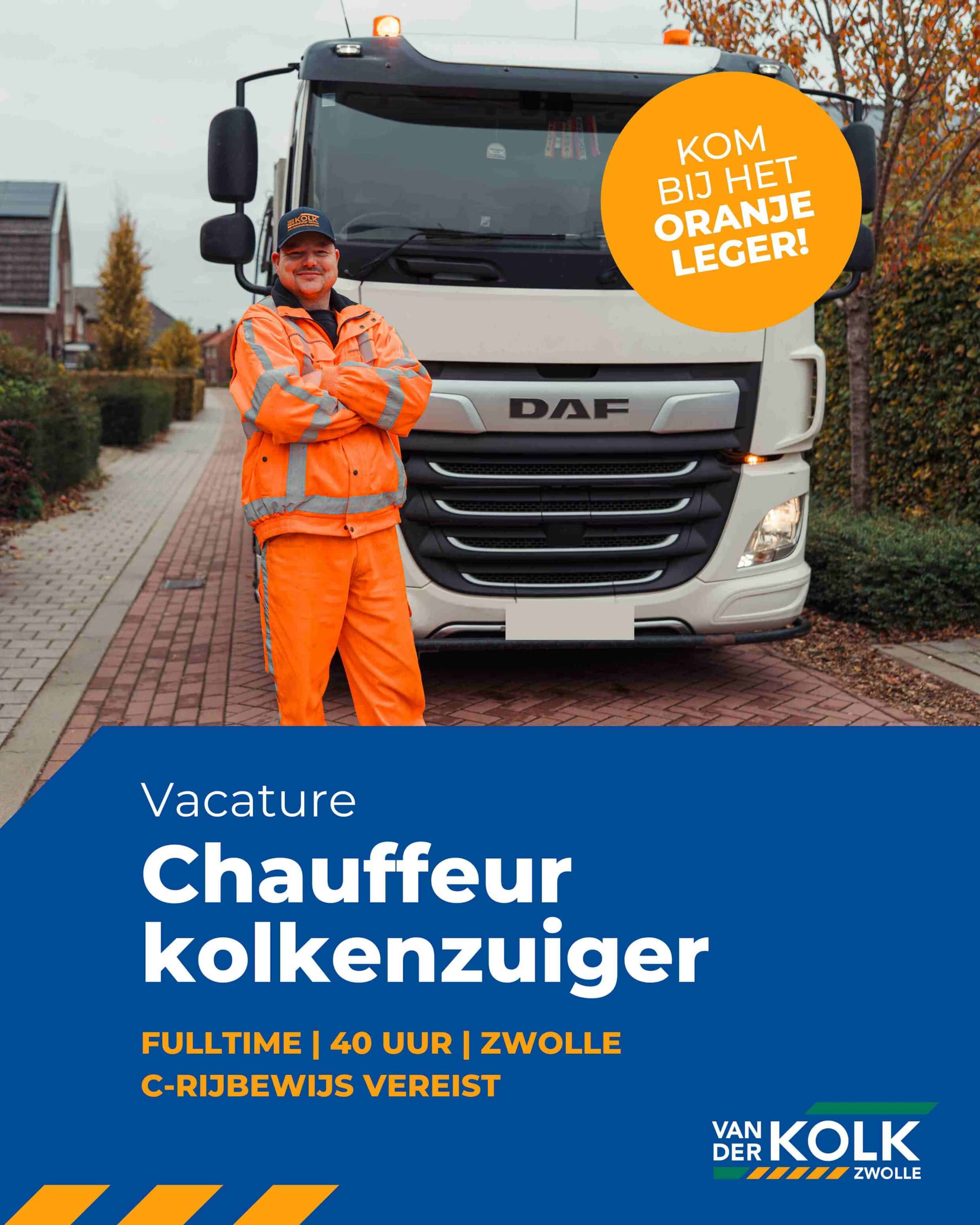 Chauffeur kolkenzuiger "Kom werken bij het Oranje Leger" Full time | 40 uur | regio Zwolle Wil je actief bezig zijn in de buitenlucht? Heb je zin om samen op pad met bijrijder van een kolkenzuiger te gaan? Solliciteer dan…